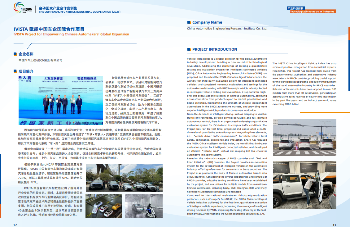 在产业合作层面,汽车指数也实现了重要进展。为推动创新金砖、绿色金砖建设,促进“大金砖合作”高质量发展,工业和信息化部办公厅组织开展了金砖国家产业合作案例征集工作,共评选出37个2025金砖国家产业合作案例并于9月16日在 2025 金砖国家新工业革命伙伴关系论坛上正式发布。中国汽研牵头报送的《IVISTA赋能中国车企出海:“测评新基建”共筑汽车产业协同发展新生态》入选。IVISTA中国智能汽车指数立足智能汽车测试评价,助力中国车企高端化、全球化战略。