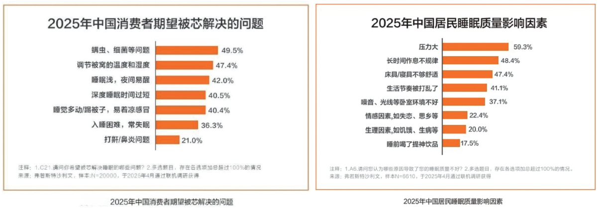 根据《白皮书》,消费者认为压力大(59.3%)、长时间作息不规律(48.4%)及床具/寝具(47.4%)是影响睡眠质量的主要因素。其中,床具/寝具作为唯一与居民生活习惯不直接相关的因素,反映出居民对“优质的床具/寝具能够改善睡眠”的普遍认知。而被芯作为与人体直接接触、影响睡眠环境的关键产品,其材质、设计和功能的创新,对提升睡眠质量有着重要作用。