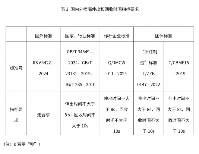 智能马桶喷嘴伸出时间是指喷嘴从机身内静止状态完全伸到清洗位置的耗时;回收时间则是清洗结束后喷嘴从清洗位置完全收回机身的耗时。国内外标准中喷嘴伸出和回收时间的最低要求见表3。