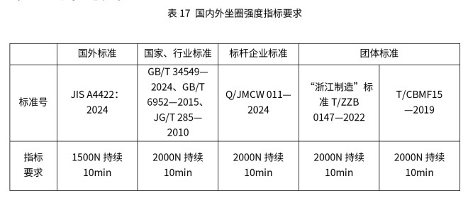 智能马桶坐圈强度指坐圈在承受外力冲击或局部压力时,不发生开裂、变形、断裂的能力。国内外标准中坐圈强度的最低要求见表17。
