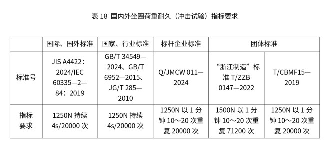 智能马桶坐圈荷重耐久(冲击试验)指坐圈在长期重复承受外力冲击或局部压力后,仍能保持完整性,不发生开裂、变形、断裂等现象。国内外标准中坐圈荷重耐久的最低要求见表18。