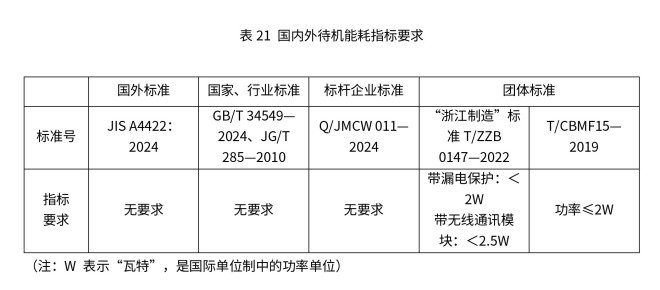 智能马桶待机能耗指智能马桶在未执行核心功能、仅维持基础电子系统运行时的电能消耗。国内外标准中待机能耗的最低要求见表21。