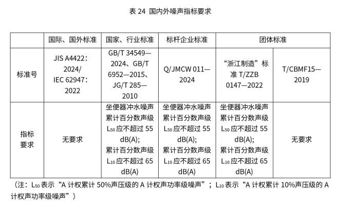 智能马桶噪声指产品在运行过程中产生的、超出环境背景音的机械振动声、水流声等,直接影响用户的使用体验与居住环境静谧性。国内外标准中噪声最低要求见表24。