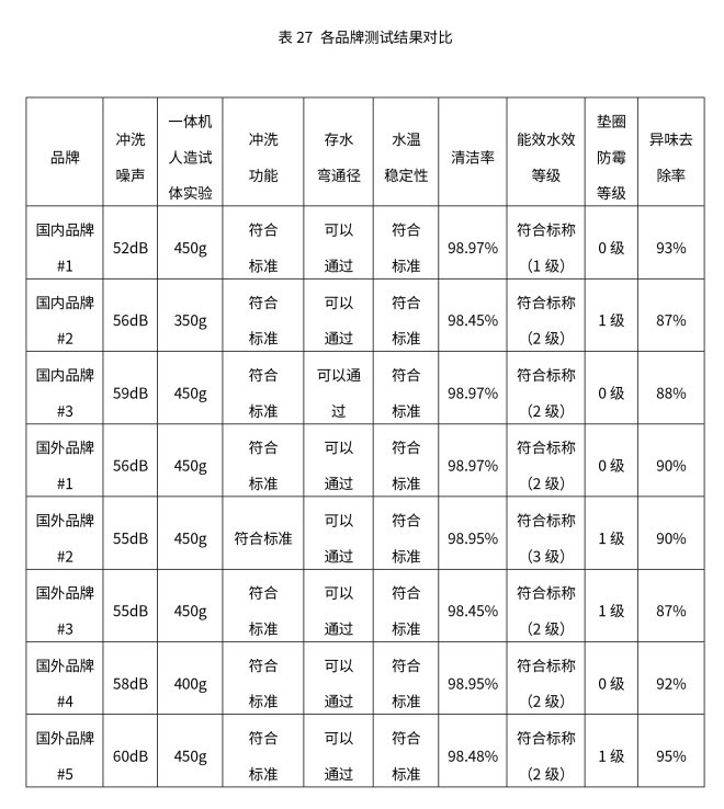 结果显示,这8款产品的冲洗噪声全部在52分贝至60分贝之间,均达到了5A级。其中,国内品牌#1产品冲洗噪声最优,达到52分贝;8款产品排出的人造试体质量全部达到3A级以上标准。其中,国内品牌#2为350g(3A级),国外品牌#4为400g(4A级),其余6个品牌均为450g(5A级)。根据GB/T 23131—2019《家用和类似用途电坐便器便座》中的规定,智能马桶的清洁率应不低于90.0%,按照98.0%、96.0%、93.0%、90.0%界值可分为A、B、C、D四个等级。测试结果显示,这8款产品的清洁率在98.45%~98.95%间,均达到了A级。本次比较试验同时对垫圈防霉等级进行了测试,结果显示,这8款产品的垫圈抗菌率均大于99.9%,垫圈防霉等级均满足GB/T 23131—2019《家用和类似用途电坐便器便座》中规定的至少达到1级的要求,其中,国内品牌#1、国内品牌#3、国外品牌#1和国外品牌#4垫圈防霉等级更是达到0级水平。本次比较试验还以氨气模拟异味物质,对8款产品的除异味能力进行了测试。结果显示,它们的异味去除率均在87%以上,其中国外品牌#5、国内品牌#1、国外品牌#4达到90%以上。中外品牌比较结果见表27。