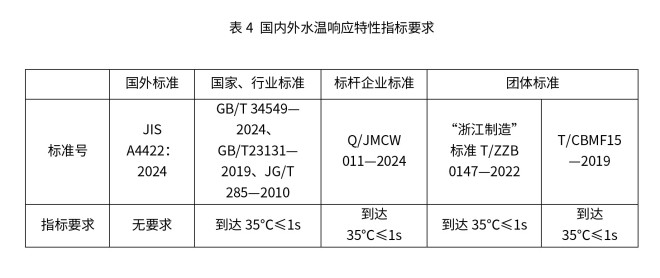 智能马桶水温响应特性是指从用户启动清洗功能(如臀洗、妇洗)开始,其喷嘴出水的温度从初始状态升至特定温度的速度,其核心指标为响应时间。国内外标准中水温响应特性的最低指标要求见表4。