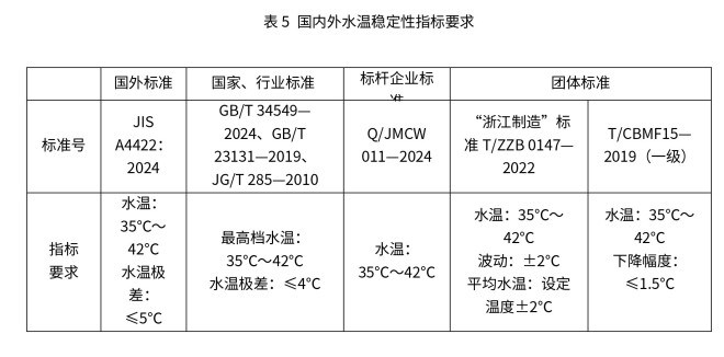 智能马桶水温稳定性是指在清洗功能开启的全过程(含初期升温后、持续清洗中、进水/流量波动时)中,出水温度始终保持在用户设定范围(通常32℃~40℃)内,且无明显波动及骤升或骤降的性能表现。国内外标准中水温稳定性的最低要求见表5。