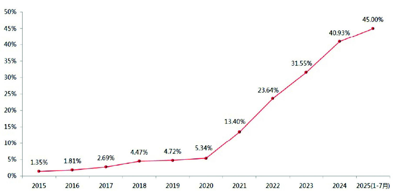 图二 2015—2025(1—7月)国产新能源汽车渗透率