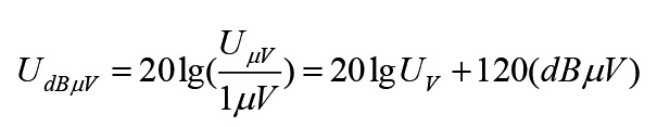 在GB/ T 18 6 5 5-2010中对于传导干扰 的 测试 频段 规 定 在150kHz~30MHz,而仿真只能得到干扰的时域波形,因此需要将LISN得到的电压时域波形进行快速傅里叶变换(FFT)转换成频域波形。由于转化为频域后线性坐标无法直观地观察传导干扰随频率的变化趋势,故需要将曲线的横纵坐标均转化为对数的形式。其中,横坐标只需将步长设置成log步长,单位为MHz纵坐标;需要将测得的传导干扰单位伏特(V)转化为 ,具体转换公式如式(5)所示。