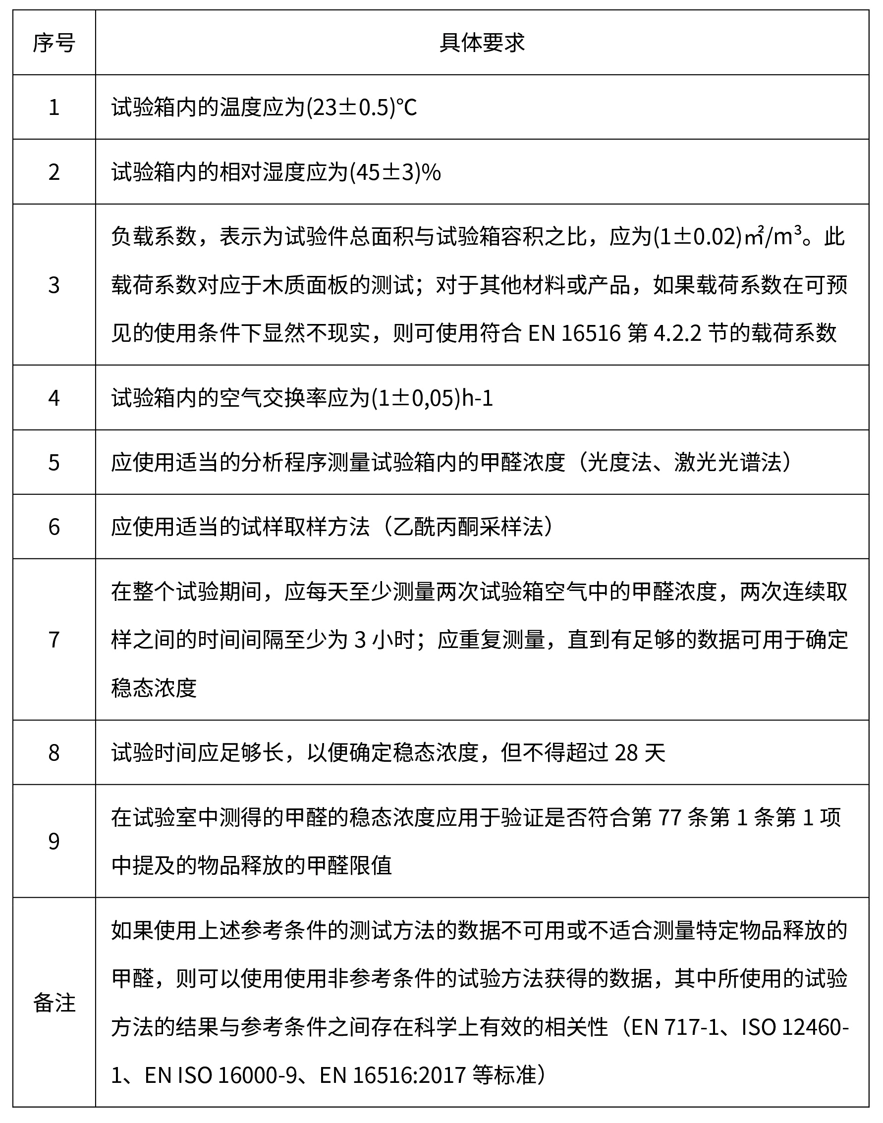 为支持新规实施,欧洲化学品管理局(ECHA)于2025年5月发布了《甲醛释放量及浓度测量指南》。根据该指南,对于道路车辆(整车),甲醛浓度须根据ISO 12219-1《道路车辆内部空气第1部分:整车试验箱驾驶室内挥发性有机化合物测定规范和方法》和ISO 12219-10《道路车辆内部空气第10部分:整车试验箱 车厢内部挥发性有机化合物的测定规范和方法卡车和公共汽车》方法中规定的条件,在环境模式(常温模式)下进行测量,测试对象应为新车下线后23 〜33天内的车辆;对于车辆零部件,若车辆原始设备制造商(OEM)能够证明该零部件已安装在根据上述ISO 12219-1或12219-10 标准测试合格(即满足整车甲醛限值要求)的道路车辆内,则该零部件本身无需进行额外甲醛测试,例如由OEM生产,在欧洲组装入整车并通过了整车甲醛测试的零部件,可免于单独进行测试。未经OEM控制的部件,则必须按照该指南附录14规定的测试条件进行评估。在此测试条件下,其甲醛释放浓度限值为0.08 mg/m³,该要求自2026年8月6日起生效。