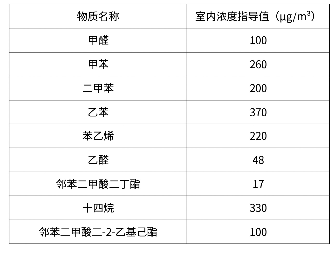 日本汽车工业协会(JAMA)以车室内也是居住空间的一部分为由,参考室内污染物管控政策,提出了减少汽车内饰VOC的自愿倡议,在13种室内污染物中去掉了4种主要用于杀虫剂的物质,一共包括9种物质,分别为甲醛、甲苯、乙苯、二甲苯、苯乙烯、乙醛、邻苯二甲酸二丁酯、十四烷和邻苯二甲酸二-2-乙基己酯,其浓度要求见表3。
