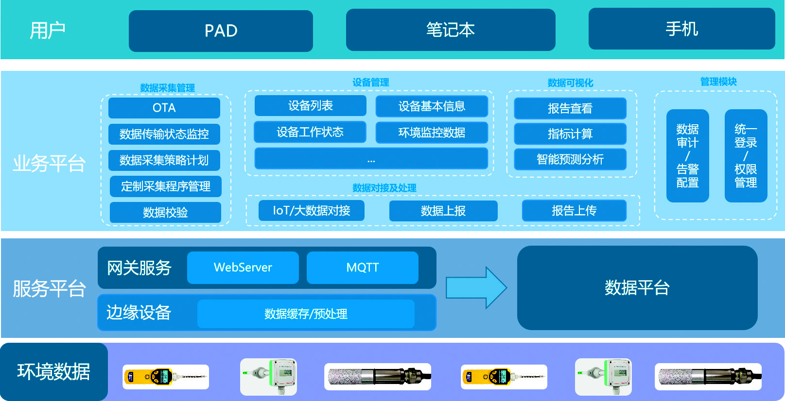 应用服务层通过网页平台(Web)、移动应用程序(APP)等多种形式为用户提供实时监控、历史查询、报警管理、报表生成等功能,支持多角色权限管理,确保系统操作的安全性与数据隔离。