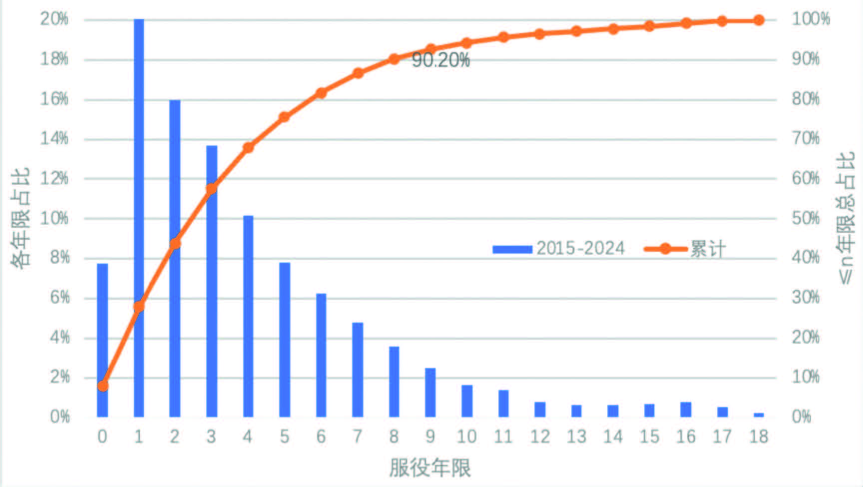 服役年限跨度0〜20年,其中,服役1年车辆的腐蚀投诉占比最高,服役8年内的投诉累计占比超过90%。服役时间越短,车辆腐蚀投诉被响应的概率越高。