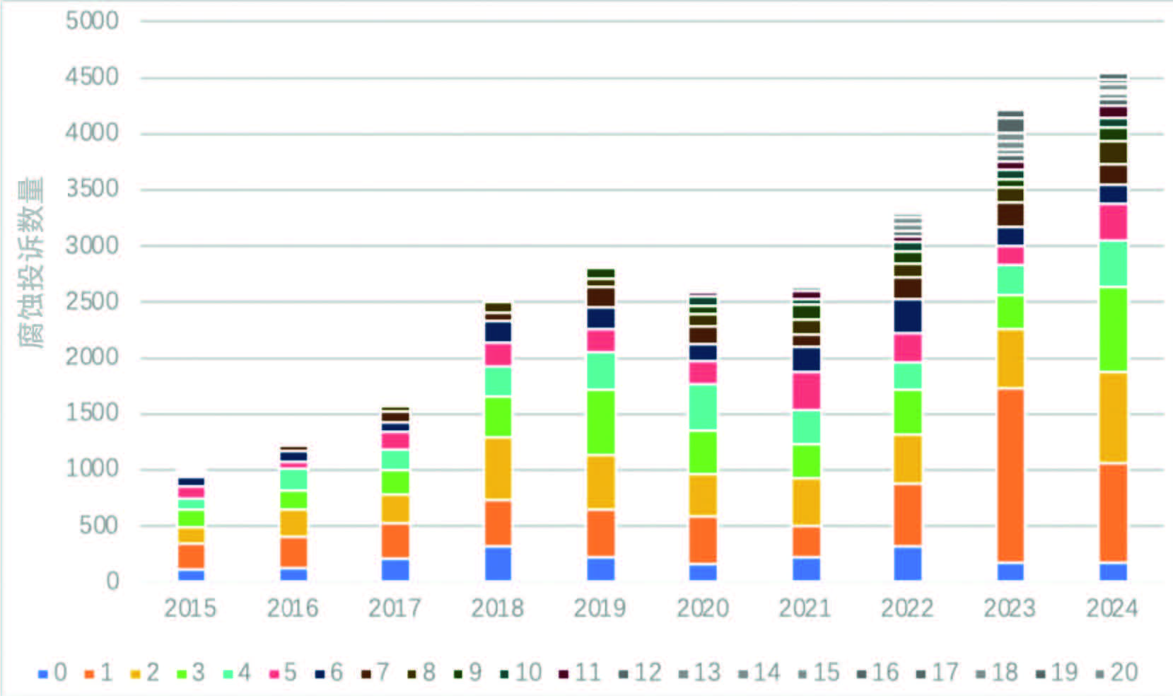 进一步分析发现,2015—2024年不同服役年限的车辆腐蚀投诉案例整体呈增长趋势,见表 2、图 2 。其中,2020—2021年投诉量略有下降,但 2023—2024 年迅速攀升。同时,短服役年限车辆的腐蚀投诉占比逐年增大,这一现象既体现了消费者对汽车腐蚀问题的关注度提升,也反映出当前汽车行业在耐蚀质量管控方面存在参差不齐的问题。