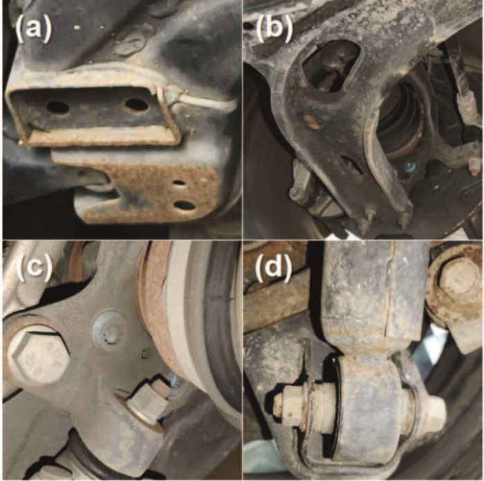 图6 连杆与悬架件典型腐蚀形貌 (a)前副车架;(b)前下摆臂;(c)转向节;(d)后减震器