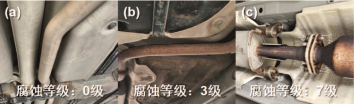 图7 排气管路典型腐蚀形貌 (a)未腐蚀;(b)轻微腐蚀;(c)严重腐蚀