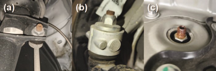 图9 紧固件典型腐蚀形貌 (a)直拉杆支架紧固螺栓;(b)转向横拉杆球头紧固螺栓;(c)减震器塔座紧固螺栓
