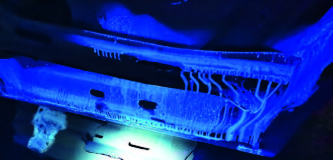 空腔灌蜡设计是一个系统工程,需要和白车身车体设计以及制造同步工程协同,并不停地进行验证和修改,进行预批量生产时质量部门还会频繁地破检车辆,使用紫光灯(蜡荧光剂会显影)进行蜡量和范围的检查,且反复论证直到批量生产,见图4。奥迪在概念设计阶段就定义了灌蜡范围、灌蜡孔和沥蜡孔及操作空间,兼顾拧紧和后续安装等要求。