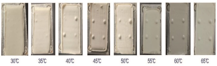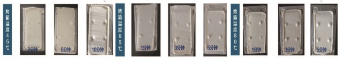 其中45 ℃烘烤10分钟、65 ℃烘烤5分钟、80 ℃烘烤3分钟时,气泡状态相近