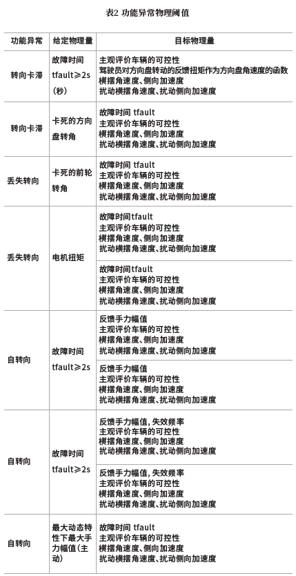 可控性评估按ISO 26262 《道路车辆功能安全》规定进行,等级分为:C0(可控)、C1(简单可控)、C2(一般可控)、C3(难以控制或无法控制)。评估中需将与车辆发生故障时可控性相关的失效模式和驾驶操控进行组合测试。可控性评估应对每个失效模式对应的物理量阈值进行确认[5],具体见表2。