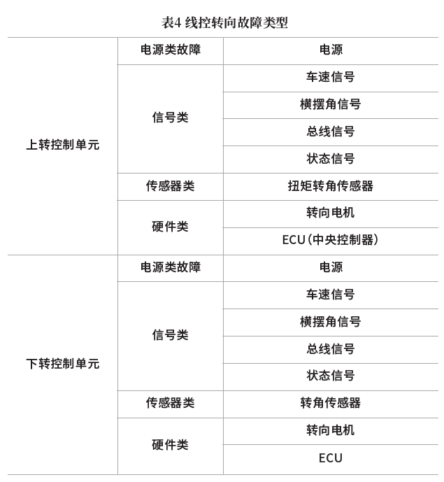 线控转向电子控制系统(SBW)是一套为驾驶者转向提供动力辅助的控制系统,分为上转控制单元和下转控制单元,两者共同协同控制来自驾驶者的扭矩输入和来自动力辅助电动机的扭矩。本文针对典型SBW系统进行结构分析,梳理潜在失效模式和失效机制,结合测试需求搭建故障注入系统[6]。线控转向故障类型见表4。