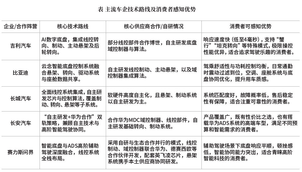 国内主流车企围绕智能底盘布局了不同技术路线,差异化优势直接对应不同消费者的需求(如追求操控、注重舒适、青睐智能科技等),具体见表。