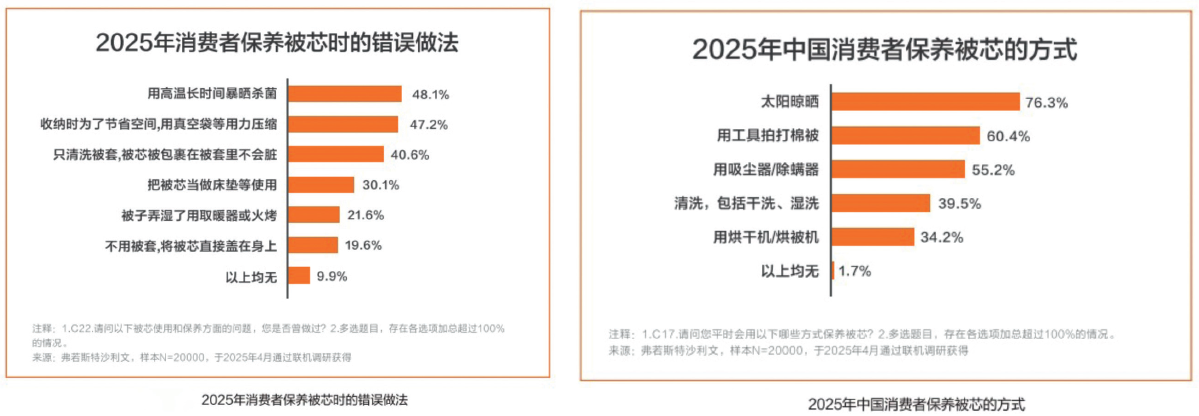 《白皮书》还显示,消费者对于如何正确保养被芯存在一定认知误区。其中,48.1%的消费者曾通过长时间在烈日下暴晒被芯杀菌,此举可能会加速被芯纤维老化,导致其保暖性下降和使用寿命缩短;47.2%的消费者在收纳时为了节省空间,曾用真空袋等用力压缩被芯,这可能会降低被芯蓬松度,产生结块等现象;40.6%的消费者只清洗被套,认为被芯包裹在被套里不会脏。实际上,人体分泌的汗液、皮屑等会透过被套渗入被芯,仅清洗被套无法去除被芯内部的污垢、细菌及尘螨,长期积累易影响被芯使用体验与睡眠健康。