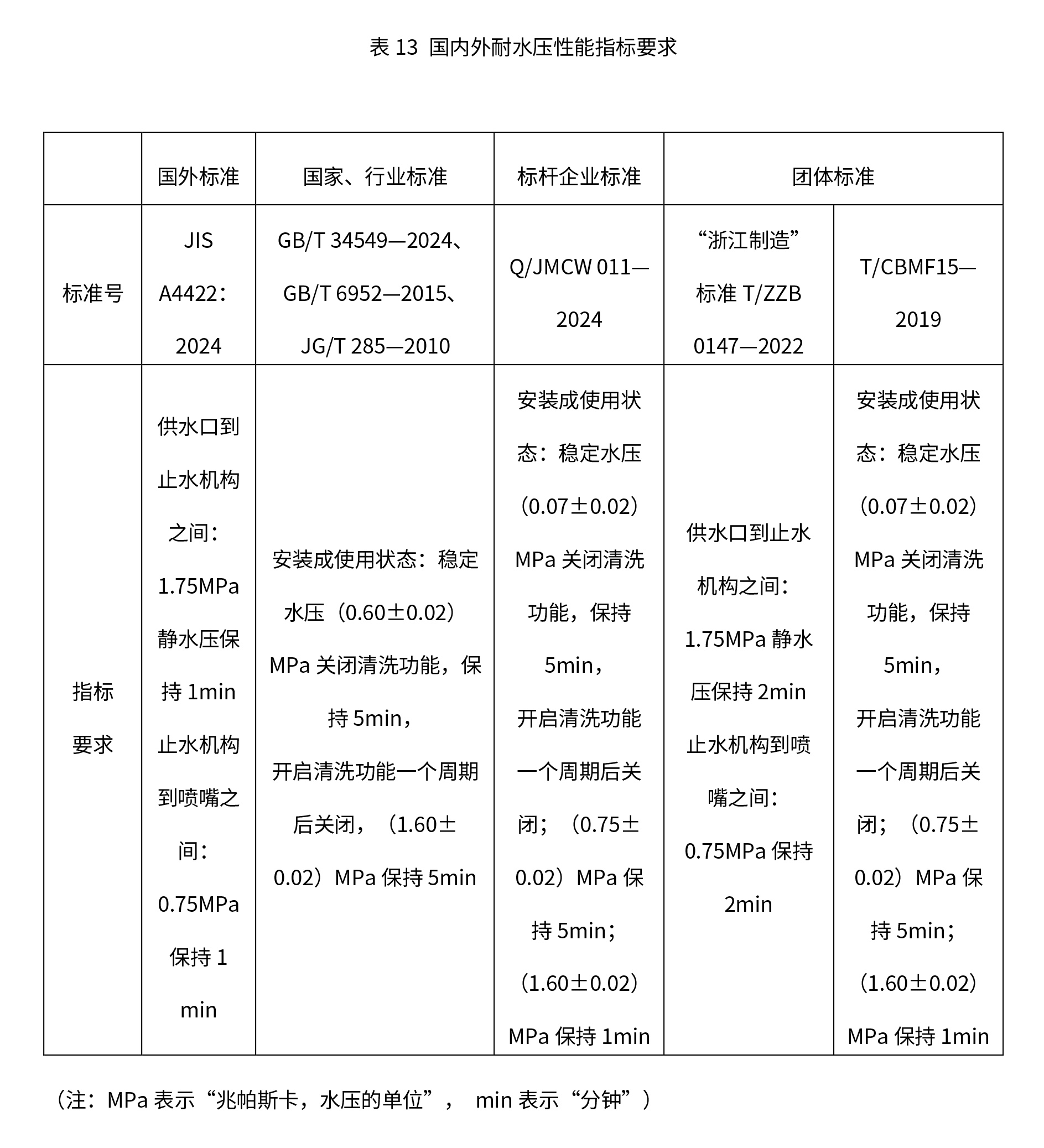 智能马桶耐水压性能指智能马桶(尤其进水组件、管道、密封圈等部位)在长期或短期承受自来水供水压力变化时,不发生破裂、渗漏、变形的能力。国内外标准中耐水压性能的最低要求见表13。