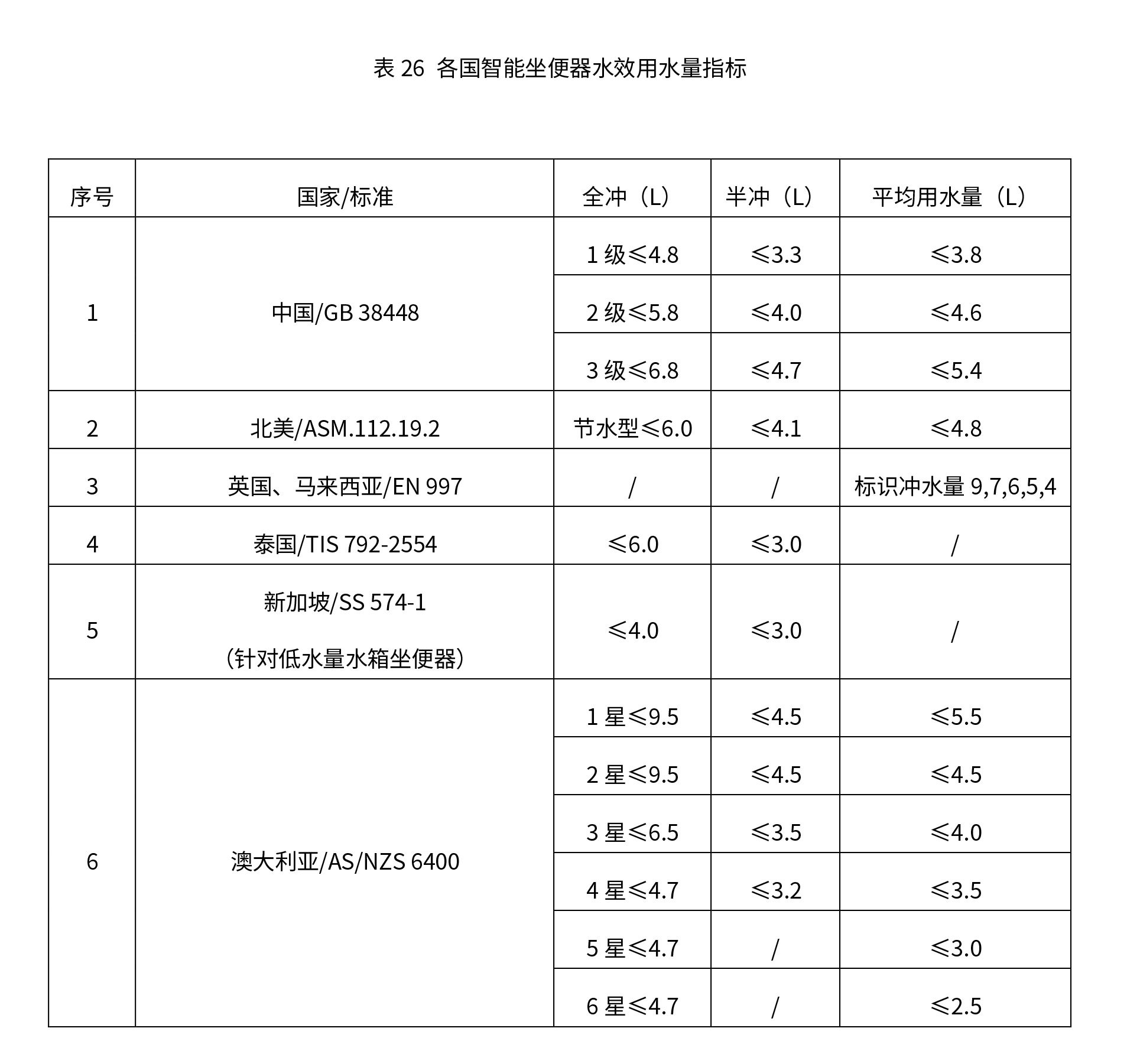 我国智能马桶标准对冲洗用水量及水效限定值的要求,与北美、澳大利亚、英国、泰国等国家或地区的要求基本持平,其中1级水效指标优于其他国家节水型要求。各国智能马桶水效用水量指标见表26。