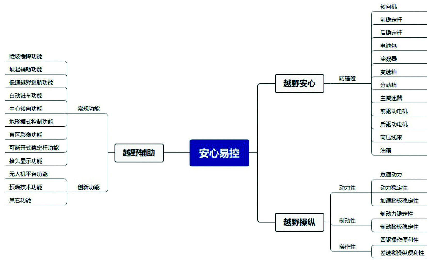 安心易控主要包含三个维度:越野安心、越野操纵和越野辅助,如图一。越野安心是从机械设计上考虑越野过程中因磕碰等滥用场景对车辆部件造成损害的评估,主要包括底盘系统、动力系统、热管理系统等;越野操纵则从整车的动力性、制动性以及操作便利性等方面,对越野车的性能及人机便利性进行评价;越野辅助主要对越野车的辅助性智能化控制功能进行评价,主要考核常规配置的陡坡缓降、上坡辅助等创新功能。
