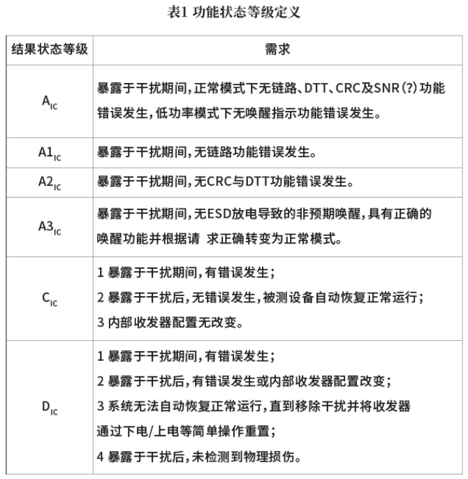 以太网芯片EMC抗扰测试中均规定了两种等级状态的测试,即等级AIC和等级CIC或DIC的测试。等级AIC的测试为故障测试,测试达到该等级时的极限功率或者电压强度;等级CIC或DIC的测试为破坏性测试,测试要求功率或者电压强度下芯片是否满足CIC或DIC的要求。等级状态的定义如表1所示。