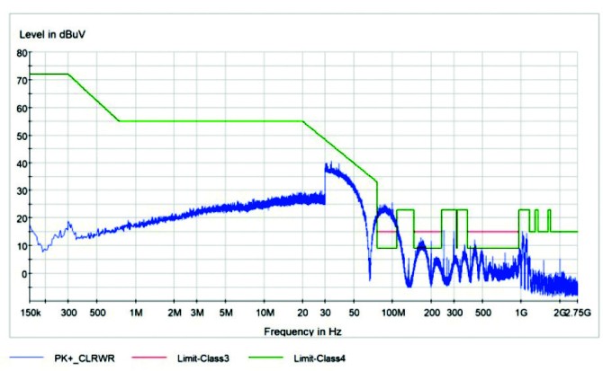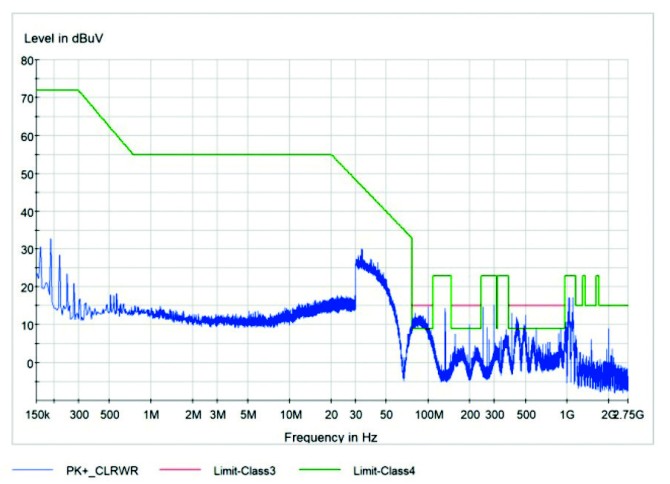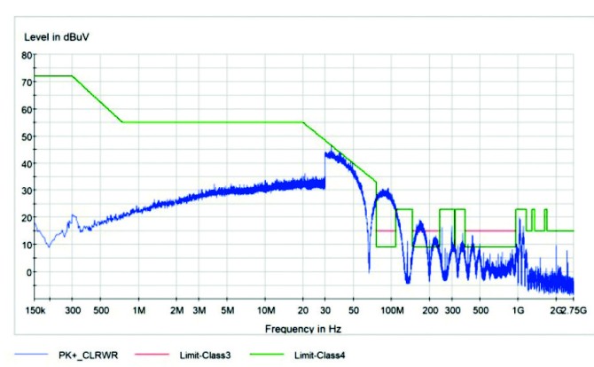其中,绿色的为限值曲线,蓝色的为测试结果曲线。按照标准要求,测试结果在全频段范围内均不能超过限值线。当超过时,应进行整改以达到测试要求。