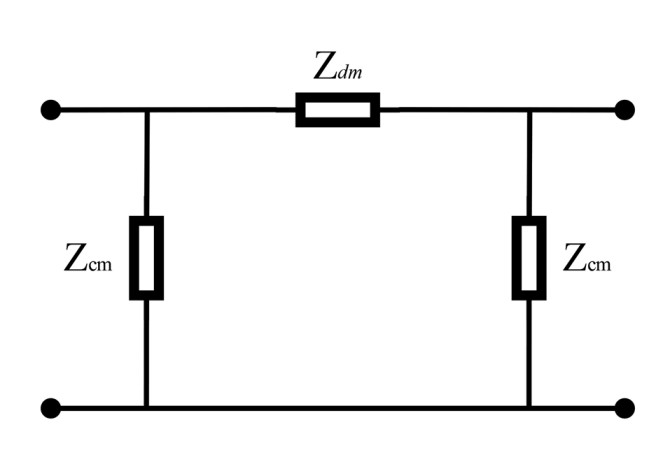 在电路理论知识中,任何一个复杂的无源线性二端口网络都可以通过三个阻抗来等效其外部特性[7]。为了对电机的内部结构进行简化,将电机的三相绕组、转子和电机外壳视为一个整体,将共模干扰和差模干扰在每相绕组中的传播路径等效为“π” 型网络,如图4所示,整个电机由三个“π”型网络构成,最终电机的三相等效“π”型网络如图5所示。在“π”型网络中,两侧为单相的共模阻抗,共模干扰通过该回路流向大地;在网络中间为差模阻抗,用于模拟绕组自身的阻抗特性,差模干扰通过该回路流向三相公共端再流入系统回路中。