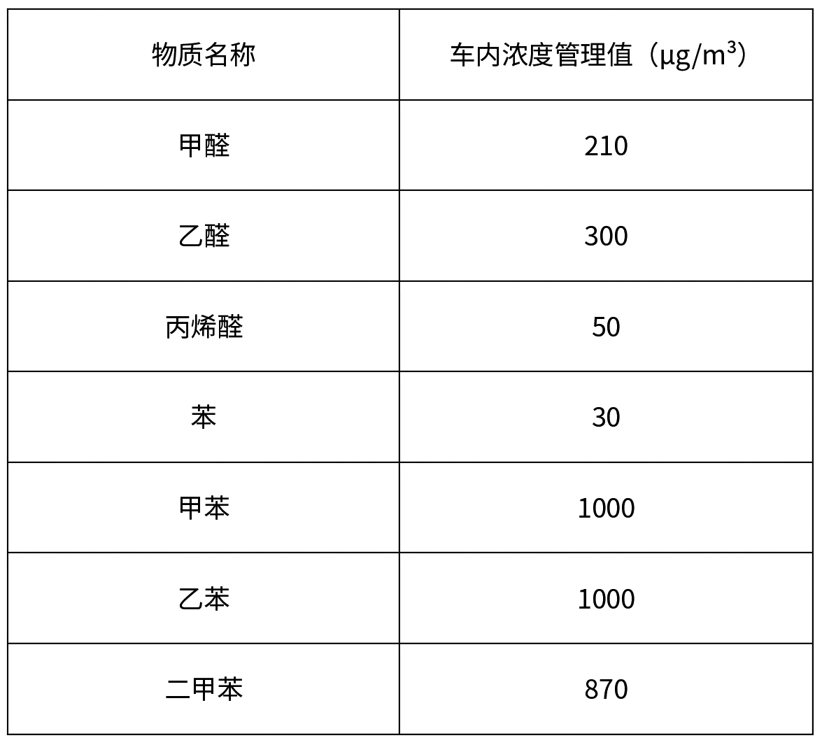 日本汽车工业协会(JAMA)以车室内也是居住空间的一部分为由,参考室内污染物管控政策,提出了减少汽车内饰VOC的自愿倡议,在13种室内污染物中去掉了4种主要用于杀虫剂的物质,一共包括9种物质,分别为甲醛、甲苯、乙苯、二甲苯、苯乙烯、乙醛、邻苯二甲酸二丁酯、十四烷和邻苯二甲酸二-2-乙基己酯,其浓度要求见表3。