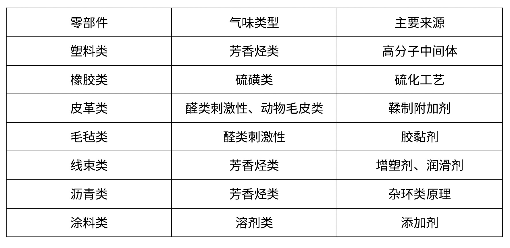 研究发现,车内空气中含有上百种化学物质,其中,引起车内气味问题的物质主要包括醛酮类、烷烃类、酯类、芳香烃类、醇类等。对这些物质进行详细分析,发现引发车内气味问题的原因主要有五,即:内饰材料产生的挥发性有机物(VOC)、车内微生物代谢产生的气味、外部进入车内的气味、驾乘人员自身携带的气味以及车内布置装饰品等其他会引起气味的主观行为。对新车来说,内饰材料是造成车内气味的主要原因。车内各类零部件由于原材料和生产工艺不同,也会产生不同类型的气味[1],具体见表1。