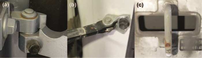 图4 铰链与连接件典型腐蚀形貌 (a)车门铰链;(b)车门开度限位器;(c)发动机舱盖板锁舌