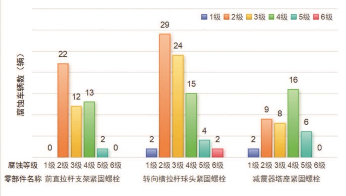 二是不同部件类别的耐腐蚀性能表现存在差异。车身钣金与覆盖件整体表现优异,腐蚀风险较高的车门尖角、折边等部位也鲜见腐蚀。铰链与连接件、连杆与悬挂件有部分腐蚀现象发生。转向横拉杆球头紧固螺栓等紧固件腐蚀率较高,需要引起企业重点关注。