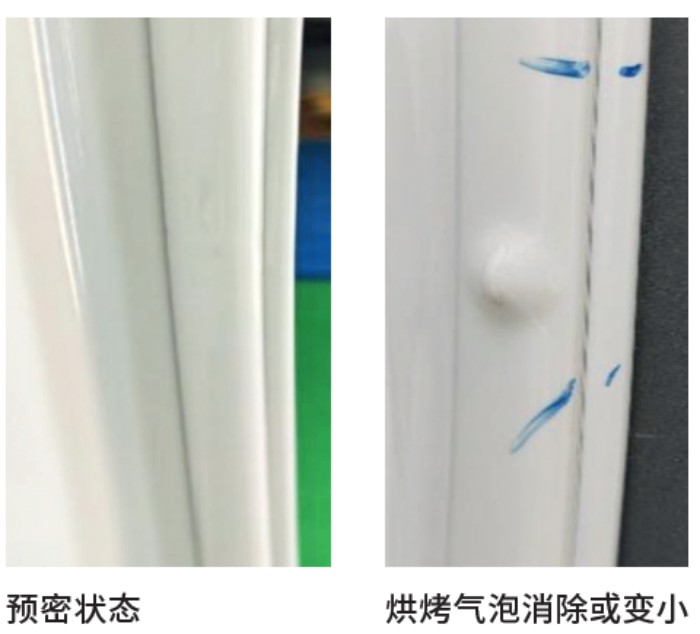压合边预密试验结论:压合边预密后进行烘干处理可有效降低FAD胶条气泡产生率,