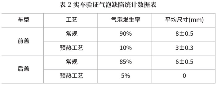 选取气泡发生率较高的前盖右侧(20台)和后盖右侧(20台)实验车作为测试对象(初始气泡率为90%)。