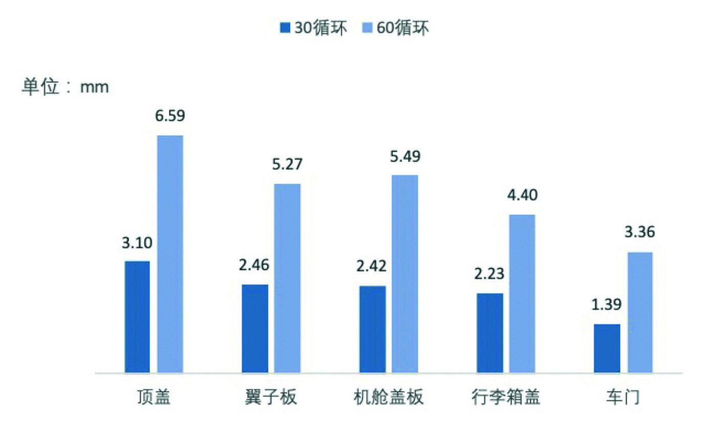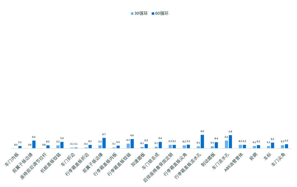 划痕分布在车门、翼子板、机舱盖板、行李箱盖和顶盖五个区域,分别统计其30循环和60循环的划痕扩散量数据,见图8。