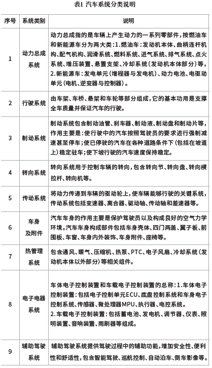 汽车是一个高度集成的复杂系统,由上万个独立零部件精密组装而成。依据汽车结构特点可将汽车分为九大系统,即:动力总成系统、行驶系统、制动系统、转向系统、传动系统、车身及附件、热管理系统、电子电气系统和辅助驾驶系统,见表1。