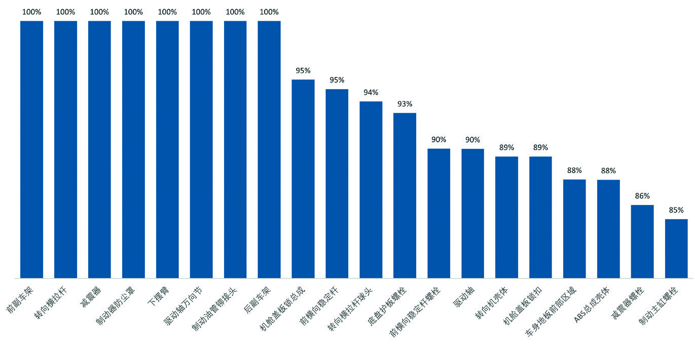 发生腐蚀频率较高的零件主要集中在底盘区域,其中副车架、转向横拉杆、减振器和制动器防尘罩等零件发生频率高达100%;发生腐蚀频率较低的零件主要集中在车身及附件区域,其中前翼子板边缘、车门内板、座椅前后调节拉杆在所有测评车中未发生腐蚀。