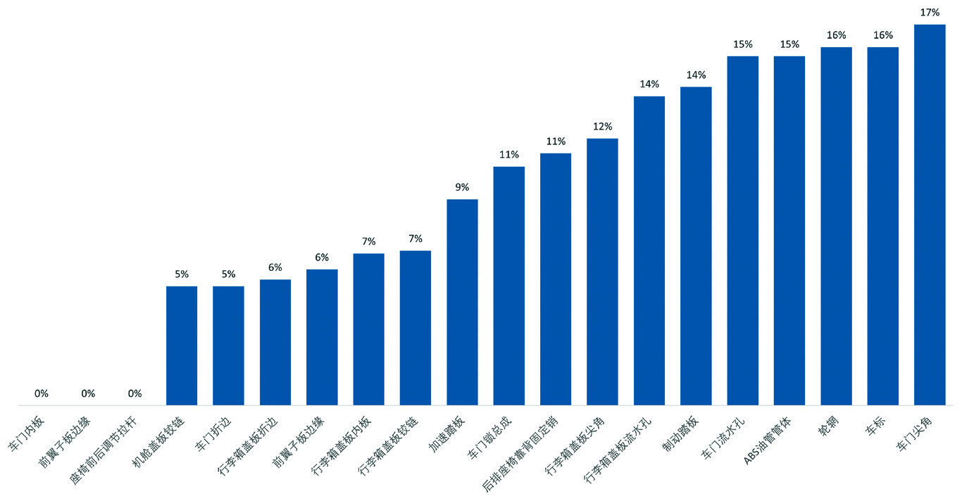 在第30循环(等效于汽车在中国腐蚀最恶劣的地区使用3年)评价节点,对统计样本中所有车型外观考核项的测评数据进行整理,根据发生腐蚀的频率进行排序,图1为发生腐蚀频率较高的20个零部件(由高到低排序),图2为发生腐蚀频率较低的20个零部件(由低到高排序)。
