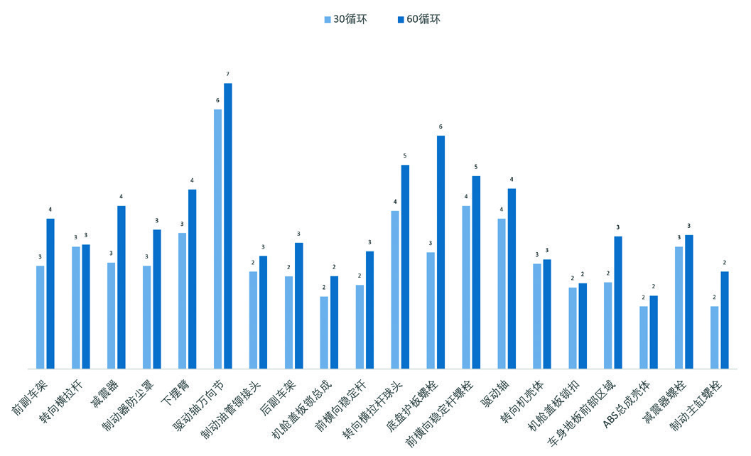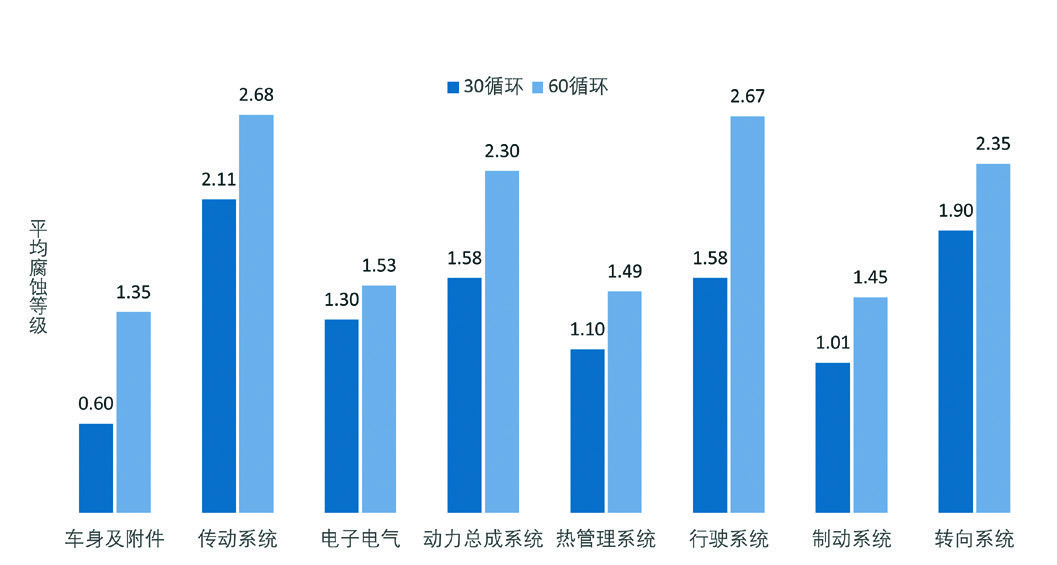 通过对比第30循环和第60循环的数据发现,无论腐蚀发生频率高低,在车辆中80%的零件平均腐蚀等级并没有激烈突变:高腐蚀频率零件平均等级增加不超过2级,低腐蚀频率零件平均等级增加不超过1级(有些无变化);在同等条件下,零件腐蚀严重程度与其耐腐蚀性能相关,试验周期的影响较小。