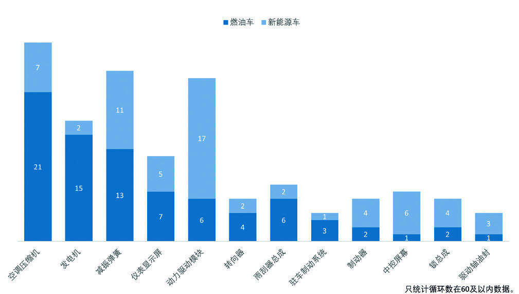 空调压缩机、减振弹簧、动力驱动模块和发电机是最容易出现故障的零件,分别出现28例、24例、23例和17例,出现次数少于四次的零件,未在该图中呈现。