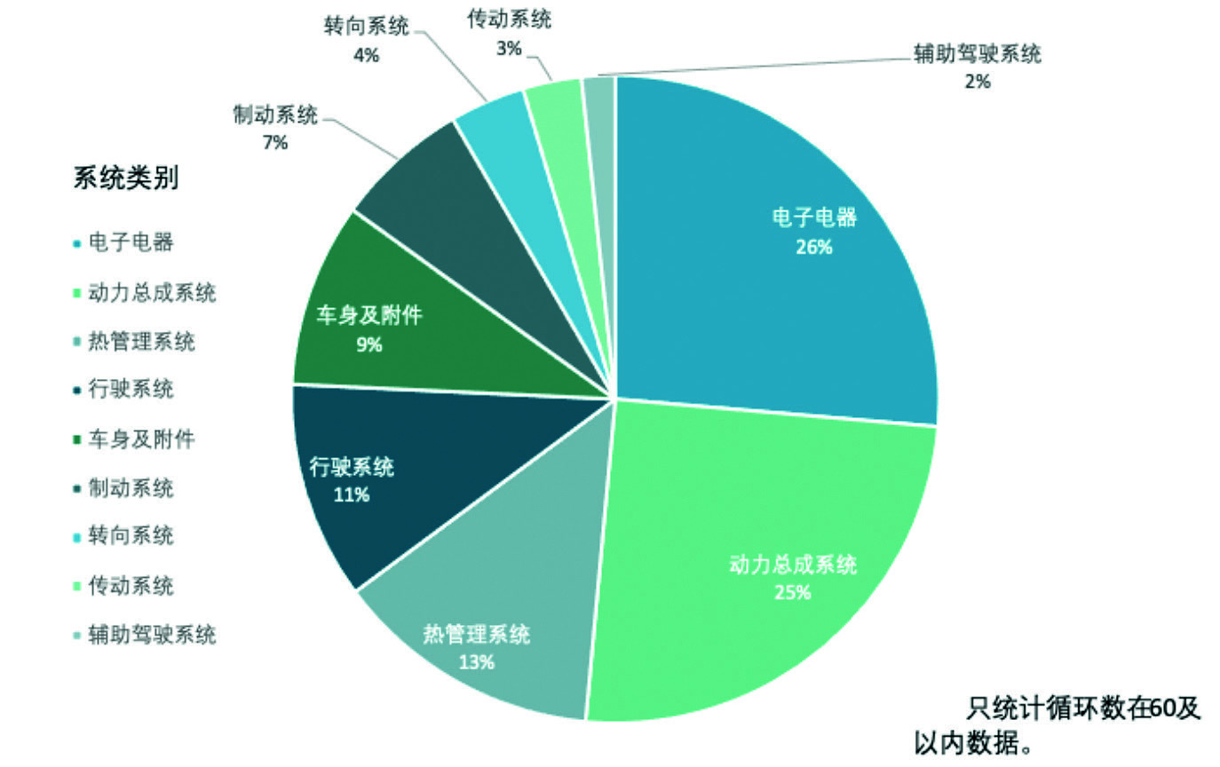 汽车腐蚀试验中,功能故障是外观腐蚀以外最受用户关注的一个指标。汽车功能故障是指汽车整车、系统(总成)或零部件部分或完全丧失工作能力。本章对近5年87辆试验车辆故障数据(仅统计60循环以内(含)的结果)进行统计、分析[1]。