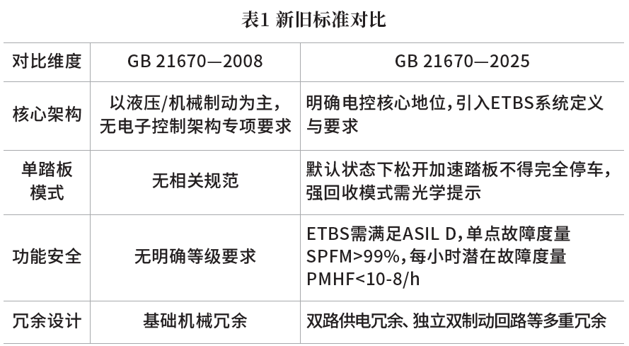 对比新旧标准,其关键差异主要体现在四个维度:一是技术架构从液压为主转向电控为核心,首次引入ETBS定义与技术要求,填补了新兴制动架构的标准空白;二是新增单踏板模式制动规范,明确默认状态下松开加速踏板不得使车辆完全停车,规避误操作风险;三是强化功能安全要求,明确ETBS系统需满足ISO 26262 ASIL D级[3]《汽车安全完整性等级 D》(它是ISO 26262标准中定义的最高安全等级,代表着对汽车电子电气系统安全性的最严格要求,主要应用于可能导致严重人员伤害或危及生命的关键安全系统)设计目标,提出严格的故障覆盖率与故障率要求;四是完善冗余设计要求,对供电、制动回路等提出双重冗余标准,提升系统失效后的安全保障能力。具体差异对比见表1。